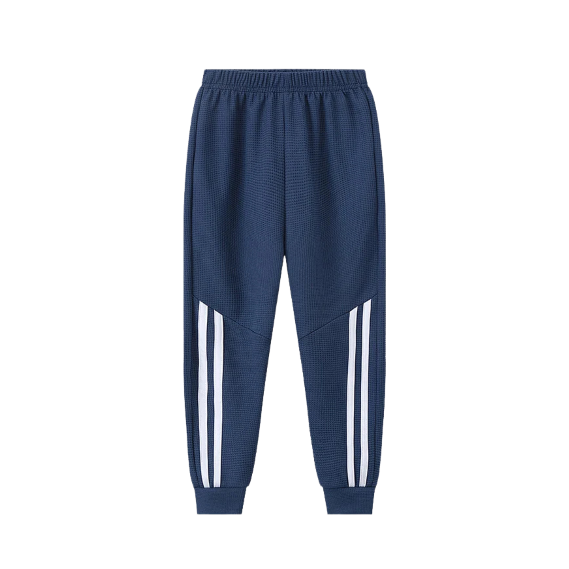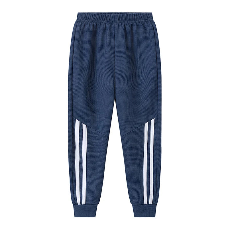 These kids’ waffle-textured jogger pants are designed for everyday comfort and active wear. Made from soft, breathable fabric with an elastic waistband, they offer a comfortable fit for play, sports, or casual outings. The modern side stripe detail adds a sporty look, while the lightweight material makes them suitable for year-round wear for boys and girls.